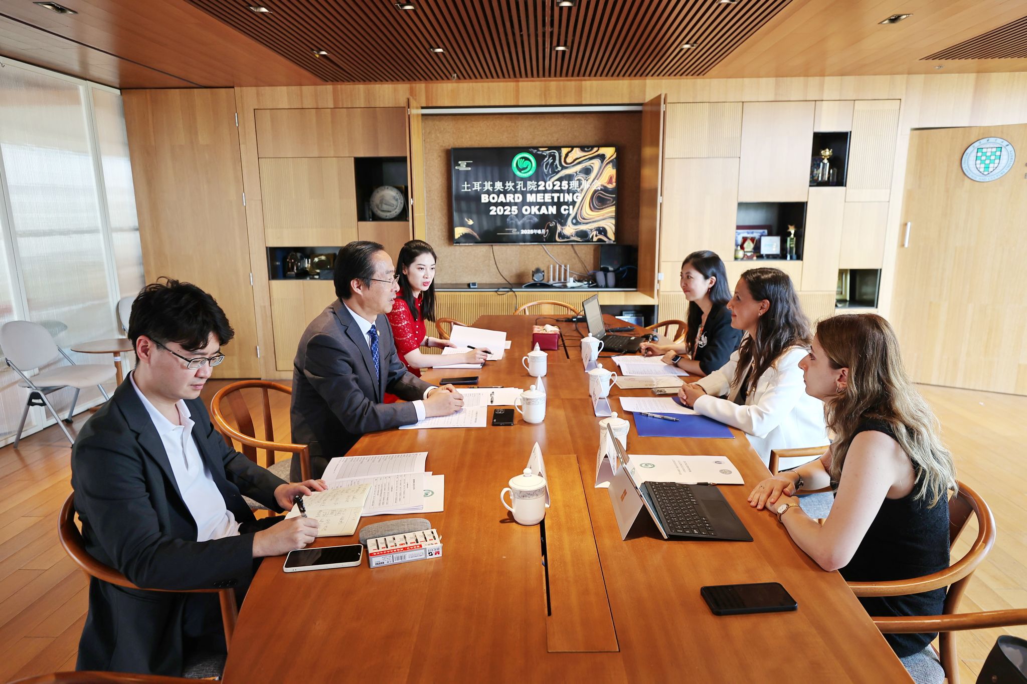 北语新闻网6月25日电(通讯员 夏泉 摄影 魏达)6月18日下午,土耳其伊斯坦布尔奥坎大学孔子学院2025年度理事会顺利召开。副校长黄益方出席会议并致辞。伊斯坦布尔奥坎大学副校长格克切·通齐(Gökçe TUNÇ)、孔子学院土方院长小花(Buket ÇETINBAŞ ERYILMAZ)、孔子学院中方院长胡巍等相关负责同志参加会议。