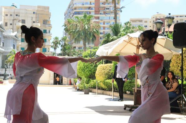 孔院学生米拉(Amira Mohamed Anwar)与玛丽亚(Mariam Mohamed Anwar)表演了敦煌舞蹈《双·生》。双人镜像的肢体语汇传递出中埃文化交融之美,展现了青年友好的时代精神。