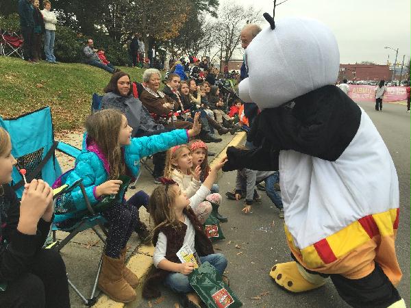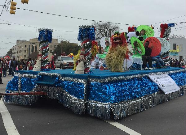 南卡大学孔院在游行筹备之初,就积极鼓励和协调当地华人协会与孔院下属东点双语小学孔子课堂参与此次盛会,并在筹备过程中主动出借服装、道具,在人力物力方面给予了大力援助,使得两支队伍在整个游行中特色更为突出。东点双语小学的花车将雪人圣诞树与熊猫、狮子等融为一体,学生身着中国特色服饰打着各色油纸伞,让圣诞节也染上了浓浓的中国味。还有吉祥物大熊猫沿途与围观民众互动,深受小朋友喜爱。当地华人协会组织了舞龙和腰鼓表演,身着传统节日盛装的当地华人在行进中高举红灯笼喜气洋洋。