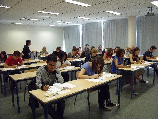 考试于当日上午8点点整顺利结束。一级至六级均在拉罗谢尔大学内设有独立的考场,考场环境安静舒适,考试过程规范有序。除拉罗谢尔大学汉语专业的学生外,拉罗谢尔孔子学院的部分学员及本市各中学汉语班的部分学生也参加了此次汉语水平考试。HSK考试报名通知的海报贴在拉罗谢尔大学教学楼大厅醒目位置进行推广,同时联系了本市开设汉语课程的中小学以确保报名信息的传达;孔院教师们积极鼓励并协助孔院学员及大学学生报名,反复核查学生报名信息、统一记录整理并登入考试系统。在安排好考试时间及地点后,通过邮件电话等方式一一通知到已报名的考生,无一遗漏。30分钟到达考场、熟悉自己的考场位置,清楚工作任务、履行自身职责。除孔子学院院长、教师、志愿者外,孔院也请来拉罗谢尔大学的汉语教师及当地小学汉语教师的协助完成考务工作。孔院工作人员在考试前一天便有条不紊地完成了考场布置工作,在大厅内挂上迎接考生的横幅、设置了考场引导指示箭头、在考场内课桌上贴上考生编号、挂起考试须知等图示、检查设备、调试音响;各级别考试的主考、监考教师当日则早早来到考场,领取试卷、考试用具等,保证了考试的顺利进行。