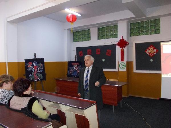 随后该校的汉语教师马薇为在场的师生们带来了一场生动的有关中国十二生肖和中国春节的讲座。马老师向大家讲述了中国的春节的一些特色风俗,教在场的罗马尼亚师生用汉语拜大年。之后简要的向大家介绍了有关中国十二生肖的一些有趣的故事。一个个小问题和来自中国的小礼品把整场讲座推向了高潮。每个学生都满意地拿到了自己喜爱的生肖卡片,并且拿到了象征着美好和年年有余的可爱的小羊和小鱼剪纸。讲座在一片掌声中落幕,师生们在浓浓的中国节日气氛中愉快合影。