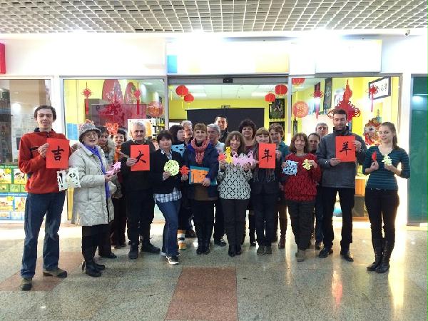 老师首先对剪纸的历史渊源、素材种类、技巧方法等做了简单介绍,然后教学生们用汉语表达剪窗花所需要的工具和方法,寓教于乐,颇有成效。剪纸过程充满了欢声笑语,学生们围坐一起,好像组成了一个大家庭,每个成员都兴高采烈地剪出对这个大家庭新春的祝福。剪纸花样里最受欢迎的就是金鱼和金羊,一条条活灵活现的金鱼带着大家“年年有余”的美好期盼,一对对栩栩如生的金羊驮着大家“羊年大吉”的诚挚祝愿。最让学生们感到惊奇的是,汉字不但可以写在纸上,还可以剪出来。当跟随老师的演示,学生们成功地剪出一个个立体的“春”字时,汉语角里充满了他们的惊叹声,他们也为自己的作品感到十分骄傲。