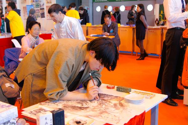 拉罗谢尔孔子学院的志愿者教师陈仕骋则在正对展会入口的醒目位置铺上宣纸、摆上砚台、提笔挥毫,向参观者们现场展示具有浓厚中国韵味的水墨山水画的创作过程,引得来往的观众长时间驻足观赏。