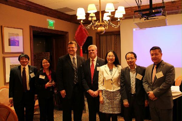 2015年2月27日晚上7点,亚特兰大商务核心地区巴克海德(Buckhead)的城市俱乐部。精致典雅的欧式会议厅里,墙上的京剧脸谱, 投影屏幕上的水墨画和丝竹管弦音乐声中的“你好,中国”系列文化短片,枝形吊灯上悬挂的中国龙凤呈祥的红灯笼,预示着吉祥如意的中国结,墙壁上悬挂的一组年代悠久的中国古典屏风……所有的元素糅合在一起,呈现出一种和谐的美。由佐治亚州立大学孔子学院主办、中华专业人士协会及亚特兰大世界贸易中心协办的中美高端商务论坛暨新春招待会,就在这样中西合璧的新年文化氛围中拉开了帷幕。亚特兰大地区的中美商务人士、华人社区来宾、多家新闻媒体及佐治亚州立大学孔子学院全体教师等100余人参加了本次论坛。