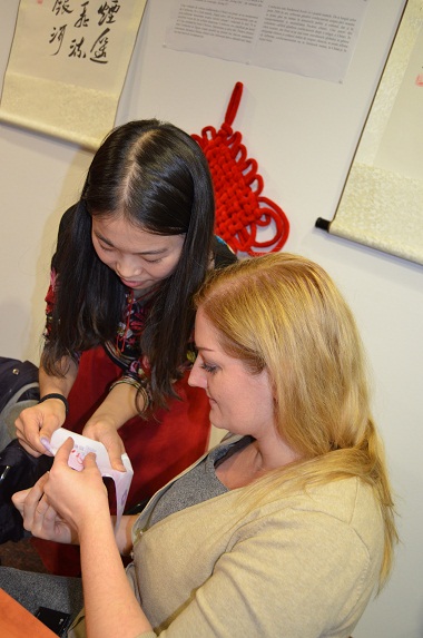 锡比乌孔子学院汉语教师志愿者李丽指导学生缝制刺绣荷包