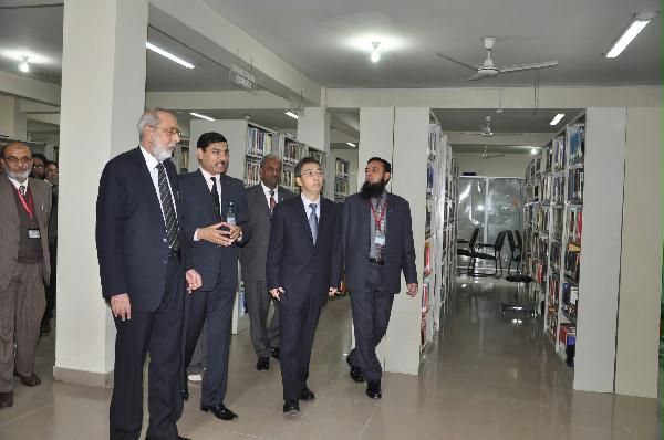 此次到访的代表共六人,以教育部部长助理陈舜为领队。在简单的欢迎仪式过后,国立现代语言大学副校长贾麦尔先生引导代表团一行参观了国立现代语言大学的图书馆,并在图书馆的会议室内向代表团介绍了国立现代语言大学的发展历程、整体情况,在介绍之余,贾麦尔先生还高度评价了伊斯兰堡孔子学院对中巴两国民间交流和文化交流中所起到的重要作用,此外,他还将国立现代语言大学未来长期和短期的发展目标和大致计划一一地向代表团做了介绍。