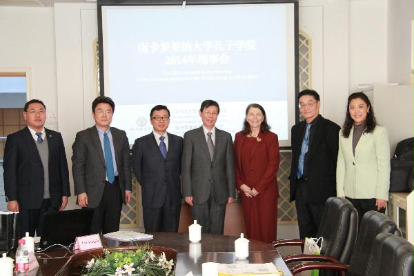 本月6日下午,美国南卡罗莱纳大学孔子学院2014年理事会在我校会议中心第九会议室召开。参加会议的外方代表包括,南卡罗来纳大学副校长玛丽·安·菲茨帕特里克教授,孔子学院美方院长叶坦教授。中方代表有,北京语言大学校长崔希亮教授,校长助理张宝钧、张维佳教授,孔子学院中方院长梁清教授,以及孔子学院工作处副处长付继伟博士。会议由张宝钧教授主持。