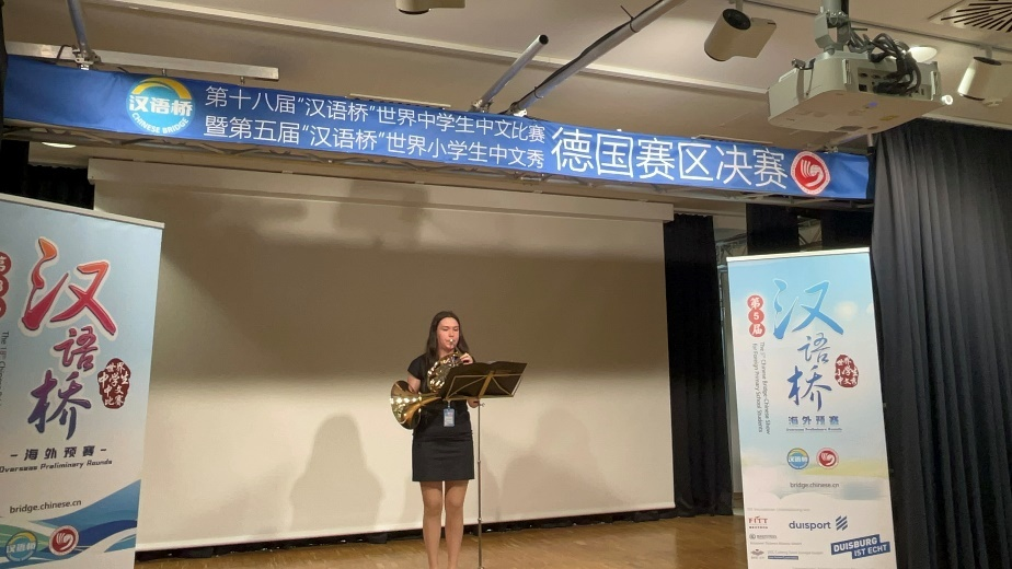 中学生组的15位选手分别通过以“追梦中文,不负韶华”为题的演讲、语言文化知识问答和才艺表演三个环节展现自己的汉语水平。排在第4位出场的16岁选手麦雅安讲述了自己学习中文的原因。由于对科学技术特别感兴趣,也了解到近些年中国在航天航空、人工智能和电动汽车等方面的卓越发展,意识到自己要实现成为科学家或工程师的梦想需要汉语加持。当她提到中国现在正研发一种更安全和创新的核能技术--钍反应堆时,全场观众对这位16岁姑娘的渊博知识啧啧称赞。在随后的才艺环节,麦雅安给观众用圆号演奏了自己改编的歌曲《欢乐颂康定情歌》,这首圆号版本的《康定情歌》无疑带给观众一种全新的听觉体验。