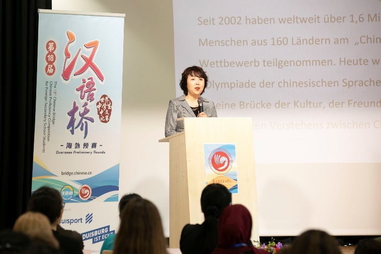 中国驻德国大使馆大使夫人史玲、中国驻杜塞尔多夫总领馆代总领事昌海涛、杜伊斯堡市副市长埃德尔特劳特·克拉布恩女士(Edeltraut Klabuhn)等嘉宾出席。鲁尔都市孔子学院执行经理乐苏珊女士(Susanne Löhr)、中国驻德国大使馆大使夫人史玲及杜伊斯堡市副市长埃德尔特劳特·克拉布恩女士分别为比赛致辞。史玲在致辞中指出,“中文承载了中华民族数千年的历史和深厚的文化底蕴,是世界了解中国的‘金钥匙’”并鼓励所有参赛者“结交更多中国朋友,以中文为翅膀,追寻‘不负韶华’的青春梦想”。