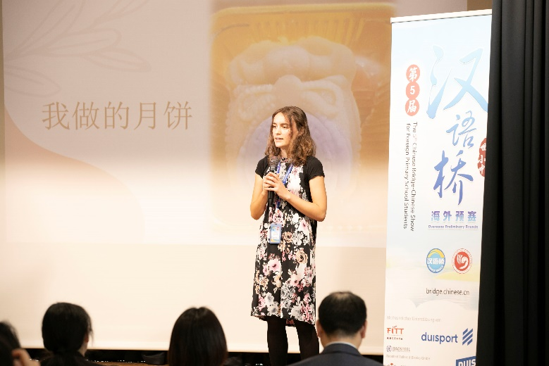 排在第7位出场的选手马洁妮去年曾经代表波恩孔院参加过汉堡孔院举办的中学生汉语桥比赛。马洁妮在演讲中回忆了这一年学习中文带给她的经历。她表示,去年的比赛一直激励着她继续学好中文。在演讲中也提到了赛后她有幸到柏林大使馆参加中国75周年的国庆庆祝活动。此次活动让她印象最深刻的是,中国的宇航员在太空录制了一段视频并回答了学生们的问题。也是因为这次活动,让她第一次品尝到月饼。随后她又参加了波恩孔院举办的制作月饼工作坊,自己亲手做了月饼。这些经历让她体会到,学习中文不仅是学习一门语言,更是发现一个新世界。这一年的经历让她有了个梦想,她希望将中文变成连接不同文化的桥梁,希望自己以后能有机会在中国工作。随后马洁妮给观众带来钢琴独奏《月光蜜语》,将《甜蜜蜜》和《月亮代表我的心》的优美旋律融为一体,琴声中流淌着柔情和怀旧,打动人心。