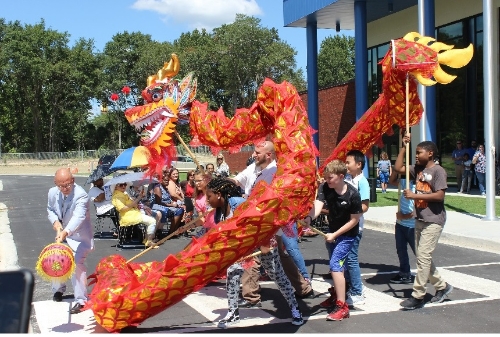 东点学校成立于2011年,在国家汉办、北京语言大学、南卡罗莱纳大学各方努力下于2014年9月正式挂牌成立孔子课堂。在南卡大学孔子学院的大力支持下,东点学校的规模不断扩大,目前在读的学生人数已达642人,居南北卡各中文项目之首。东点学校在2018年7月被美国媒体Freetimes公众票选为“南卡最佳私立/特许学校”。南卡大学孔院自东点孔子课堂成立起,每年根据需求为东点学校输送多名中文教师及志愿者,为东点中文教师提供专业的职业培训,向东点赠送中文书籍。南卡孔院全力支持东点孔子课堂的中文教学以及文化活动。今年8月,东点学校用孔子课堂的经费购买了一条舞龙和十面大鼓,并在剪彩仪式上首次亮相,为西式的剪彩增添了中国味道。东点学校也自今年起正式成立东点学生舞龙队和击鼓队,将舞龙和大鼓表演纳入教学大纲,为让学生了解和体验中国文化提供更好的条件。