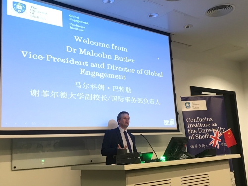 马尔科姆·巴特勒副校长向学员们介绍了谢菲尔德的城市历史及城市特色,并希望每位参训学员都能充分享受在谢菲尔德度过的学习生活时光。他还代为宣读了来自谢菲尔德市政厅商务及投资内阁成员马泽尔·伊克巴尔(Mazher Iqbal)先生的贺信,伊克巴尔先生提到:“谢菲尔德大学孔子学院是促进谢菲尔德市和中国各个城市广泛合作的重要桥梁,致力于推动谢菲尔德市与中国的商务及贸易往来,期待未来在座的30名学者也能有机会加入其中。”