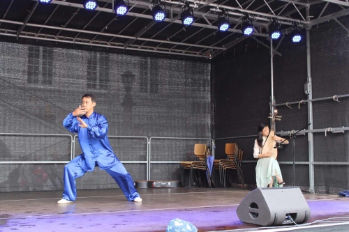 太极拳作为中国传统武术的一种,讲究中定、放松、心静,拥有众多招式及流派,主张以柔克刚,是中华武术之精髓,也是中华文化的代表之一。此次孔院日活动上,太极大师宋扬身着绸缎蓝衫,为大家介绍了太极拳的基本知识,并在市政厅前的主舞台上展示了太极拳的数种招式;从小学习中国琵琶的张隽茜老师进行琵琶伴奏,围观的观众饶有兴致,无一不拍手称赞。伴随着悠悠琴声,一同放松身心,感受专注忘我、以柔克刚的太极之美。