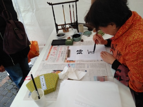 在波恩孔子学院的展位上,书法家唐红老师为来访的民众书写他们各自的中文名字。在中国著名曲目《梁祝》的背景音乐中,唐红老师一气呵成,书法神韵便跃然纸上,其独特的感染力让在场的德国民众纷纷跃跃欲试,挥毫学写,并不时向唐红老师请教,现场人头攒动,十分热闹。值得一提的是,市长Sridharan先生也向唐红老师饶有兴趣地“求赐”书法,并拿到了写有自己中文名字的墨宝,如获至宝。