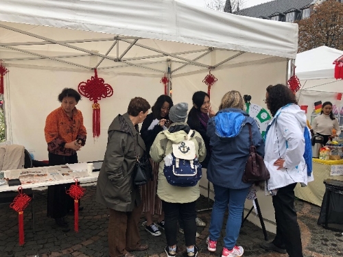 活动当天,波恩孔子学院向德国民众展示了中国民乐、太极和书法等中华传统文化。即使当天秋雨连绵不断,也依然挡不住许多民众前来参与的兴致与热情。波恩孔院设置的幸运转盘游戏吸引了大批德国民众驻足,孔院工作人员为到访的民众进行了详细的讲解,转盘上有一至十二的汉字数字,参与者先转动转盘,按转盘上的数字回答对应的汉语知识问题,答对的人即可获得波恩孔院专属的汉字钥匙链、中国剪纸册、中国结、汉字书签等精美礼物。许多访客蜂拥而来,撑着伞有序排起了长队,一边排队一边和其他参与者讨论汉字与中国传统文化,场面好不热闹。