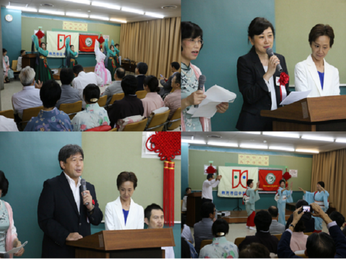 14点30分,活动拉开帷幕。中华人民共和国驻大阪总领事馆教育室刘丽勤领事、谭建川领事、大阪府枚方市产业文化部松宫祥久部长、大阪府日中友好协会副会长及孔子学院顾问户毛敏美老师、枚方市前市长及孔子学院顾问竹内脩先生、枚方市日中友好协会山中卓会长及奥野稔理事长等嘉宾莅临活动现场。孔子学院市民讲座学员及家人朋友、枚方市日中友好协会会员、关西外大的日本学生和留学生、教职员工共有200多人参加活动。
