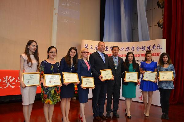 据介绍,今年共有15名罗马尼亚大中学生和在罗中国留学生获得各等奖学金,10名中罗两国教育工作者获得中国文化推广特别贡献奖和优秀奖。其中锡比乌孔子学院是拥有获奖人数最多的孔子学院,共有4名学生获得奖学金和4位教育工作者获得奖励。来自德瓦孔子课堂的马依依(Matei Cristina Valeria)和康斯坦察孔子课堂的爱丽(Stan Alexandra Georgiana)因为学习成绩优异,并且在今年的罗马尼亚中学生汉语桥比赛里取得了二等奖的好成绩,获得了“中国梦企业奖学金”三等奖;锡比乌大学中文专业的高博睿(Gabriela Fechete)因成绩和表现突出,并且将代表罗马尼亚大学生赴中国参加汉语桥决赛,获得了二等奖;最后来自锡比乌高噶中学的莉丝(Minculete Iunis)获得了一等奖,她将于10月代表罗马尼亚中学生去中国参加汉语桥决赛。颁奖典礼上,她用生动标准的汉语向大家讲述了自己的中国梦,并谢谢大家对她的支持,她会继续努力,她还表演了优美的孔雀舞,惟妙惟肖、优美舒展的舞蹈博得了满堂彩。另外,锡比乌孔子学院外方执行院长艾娃(Eva-Nicoleta Burdusel)女士、胡内多阿拉县图书馆馆长塞巴斯蒂安·巴拉( Ioan Sebastian Bara)先生和锡比乌图书馆长西尔维乌(Silviu Bors)先生共同获得了中国文化推广特别贡献奖,以表彰他们对此事业所做出的支持和帮助;锡比乌孔子学院教师孙百芳和张贝获得了中国文化推广优秀奖。