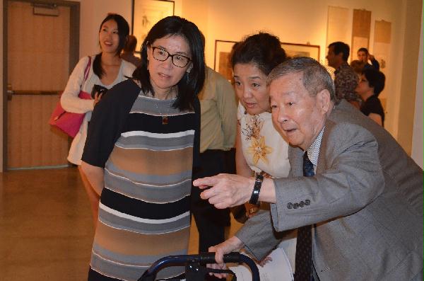 讨论会结束之后,展厅大门开启,本次展览正式开幕。大家步入展厅,欣赏品味精美珍贵的中国书法、绘画展览。本次展览共展出了各类作品超过六十件,全部来自王冀老先生的收藏。王先生出身名门,是东北军爱国将领王树常之子,从事收藏60余年,藏品年代从中国古代到20世纪。虽然本次展出的作品仅仅是老先生所有收藏品的1/5,但是已经涵盖了包括赵孟頫、八大山人朱耷、董其昌、王铎、何绍基、潘天寿、张大千、徐悲鸿、齐白石、溥儒、傅抱石、胡适、鲁迅、蔡元培、于右任、郭沫若、启功等文化名家的真迹名作,王羲之、褚遂良等一代宗师的碑帖册页,以及乾隆帝、恭亲王奕、孙中山、毛泽东、蒋介石、张学良、宋美龄、陈独秀、冯玉祥等著名历史人物的书画佳品。参展者得以如此近距离的观赏膜拜大师真迹,叹为观止,激动不已,实乃一场艺术盛宴。一位艺术专业的学生走到王冀老先生的轮椅前,以一种不敢相信的口吻说:“请问您,这里展出的那幅徐悲鸿作品就是我们所知道的那位̒徐悲鸿̓吗?我真不敢相信今天所看到的就是那些我们景仰的艺术家的真迹,太感谢您了,今天我太幸福了!”展出的书法作品还包括董作宾、邓尔雅所创作难得一见的仿甲骨文和毛公鼎金文书法作品,使观众可以体会中国文字书写沿革,从甲骨文到篆隶楷行草的发展过程。