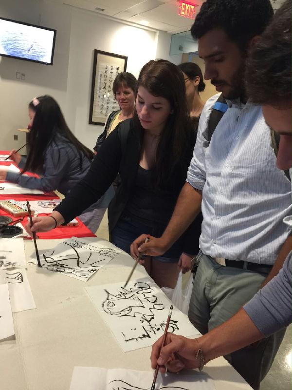 为了配合名家大展,乔治梅森孔子学院的教师和志愿者们在展厅外侧,举办现场教写中国汉字和教画中国画的活动。老师们准备了笔、墨、纸、砚和油彩画册,展示书画创作过程,为观众们提供指导讲解。感兴趣的学生纷纷前来,写一写、画一画,为画展增添了许多生动。孔院教师同时还耐心热情地解答参观者关于中国传统文化和艺术的问题。展览开幕式持续了个小时,参观者络绎不绝,盛况空前,连王老先生都说“我没有想到在美国现在有这么多人,尤其是年轻人对中国的书法绘画感兴趣,对中国的文化艺术感兴趣,这真是一件大好事,我想我做了一件有意义的事。非常感谢乔治梅森孔子学院能实现我展览藏品的梦想,为弘扬中华文化而积极努力!”闻讯远道而来观展的美国陆军参谋长助理先生对此次展览赞不绝口,他长期致力于推进中美文化艺术交流,曾协助多位中国年轻艺术家来美演出进修,他表示这是华盛顿地区绝无仅有的高水平中国传统书画展。驻美大使馆新闻处刘女士称,此次活动不光水平高,时间也恰逢其时,在习主席访美前举办这样高质量的活动能够起到民间外交的作用。此次展览为期五周。为了充分拓展文化活动的持久效果,在此其间,梅森孔院还将举办一系列文化活动,包括:中国毛笔绘画工作坊、中国书法工作坊、世界文字和书写专题讲座等,把一次展览变成持续一个多月的文化盛宴。尤其是在孔院日在即和习主席即将访美之际,通过大规模高规格的重大文化活动,为中国文化热添砖加瓦烘托气氛,进一步推进中美人文交流,并借出丰硕果实。