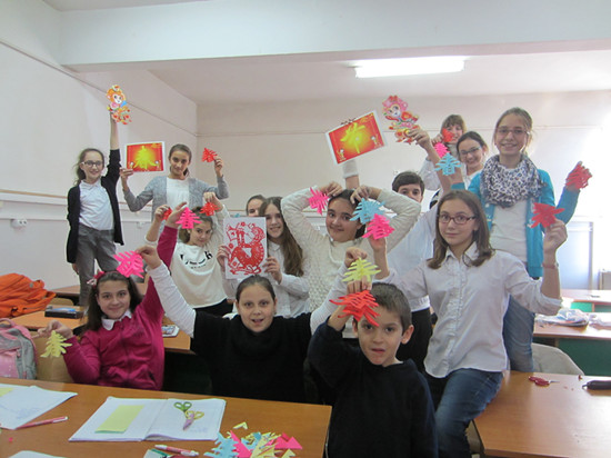 康斯坦察“乔治·格林奈斯库”中学的中国文化日活动,“学书法送祝福”、“学剪纸贴窗花”、“筷子游戏”及“踢毽子”等丰富多彩的文化体验活动,吸引了百余名学生前来参观学习。“乔治•格林奈斯库”中学校长艾琳娜(ELENA CRACEA)女士在开幕式中致辞,对康斯坦察孔子课堂在该中学开展的汉语教学活动及取得的成果表示由衷地感谢,她祝愿大家新春快乐、猴年大吉。汉语学员代表古德伟(DAVID NICULAE)等还为大家带来了精彩的吉他弹唱《新年好》和《茉莉花》,赢得了观众的阵阵掌声。大家在欢声笑语的喜庆氛围中剪出了可爱的窗花图案,写出了温暖的新年祝福,享受了有趣的围棋体验,很多学生还纷纷现场报名参加第二学期的汉语学习。