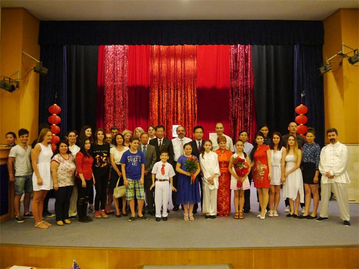 当地时间6月15日,锡比乌孔子学院康斯坦察孔子课堂在奥维第乌斯大学艺术厅隆重举办了第四届汉学日及2014-2015学年结业庆典活动。中国驻康斯坦察总领馆代办杜顺义先生、中国驻罗马尼亚大使馆教育组负责人卞正东先生、锡比乌孔子学院院长宋少峰先生、奥维第乌斯大学副校长米哈伊·格勒祖(MIHAI GIRTU)先生、鲍勃·康斯坦丁(POPA CONSTANTIN)先生、孔子课堂主任金玉兰(IOLANDA TIGHILIU)女士及课堂师生近百人参加了庆典仪式。