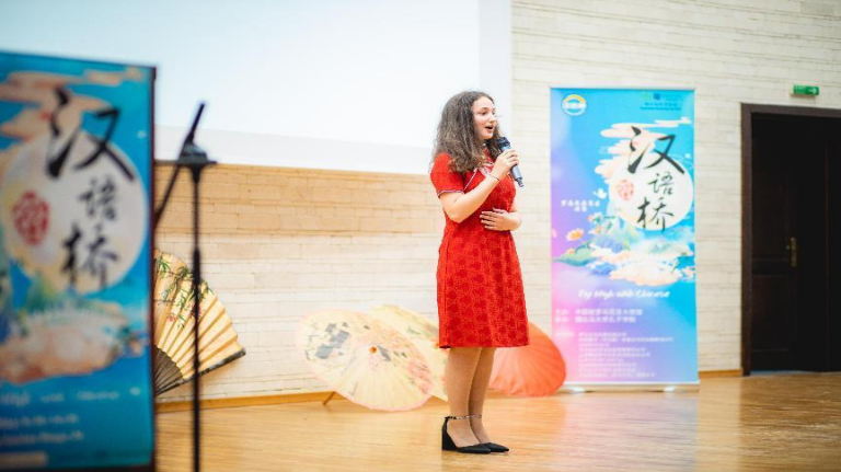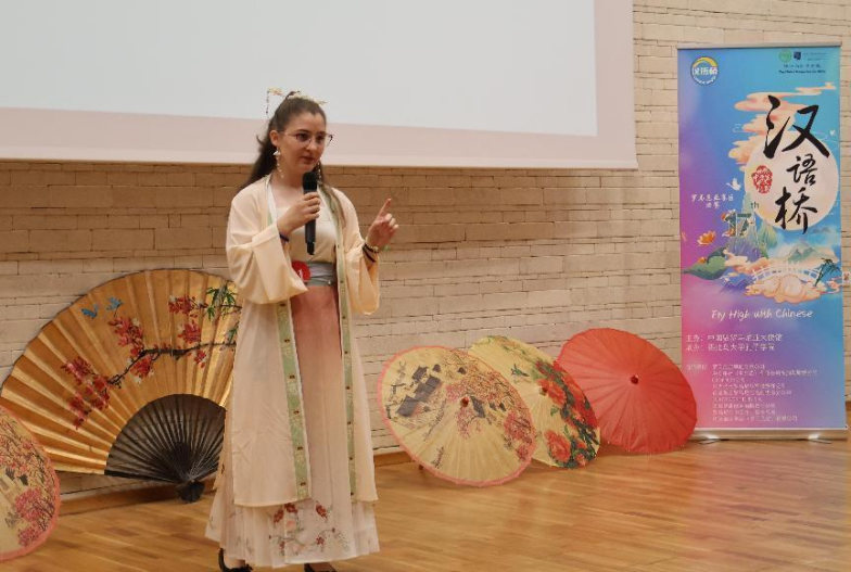 德艺燃(Talinga Ioana Gabriela),18岁,学习汉语一年半。她标准流利地讲述了自己逐梦中文的经历,又在展示茶艺的同时向大家介绍了不同茶具的用途以及饮茶的好处,落落大方的表现引得现场掌声连连。最终她以扎实的汉语基础和精彩的表演获得了一等奖的好成绩,也获得了前往中国观摩“汉语桥”世界中学生中文比赛总决赛的资格。
