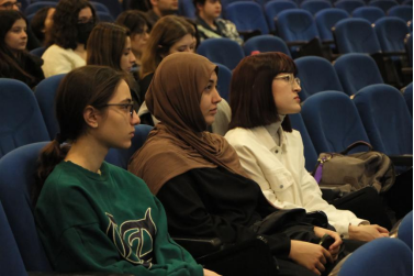 在宣讲会开始之前,奥坎大学Mevlana礼堂入口处热闹非凡。奥坎孔院的学生助理心慧(Ebrar Çalışkan)和梦乡(Sıla Dinçer)不仅热情地向学生们简单介绍宣讲会的内容,还分发了奥坎孔院及北语的小纪念品,欢迎大家的到来。线上Zoom会议室里同样热闹,很多无法到现场参加宣讲会的老师和同学都通过线上平台积极参加,其中不仅有大学生、高中生,还有许多通过奥坎孔院线上课程或者其他网络平台自学汉语的中文爱好者。有些学校,例如安纳托利亚伊玛目哈蒂普高中,还组织学生们在教室一起观看。