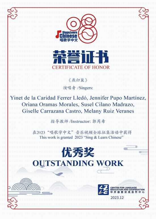 在2023年度语合中心举办的“唱歌学中文——四季如歌,美好同行”比赛中,哈瓦那大学孔子学院合唱团学生心怡、代梦妮、金月亮、王雨、王以然、艺瑟以一首音乐作品《燕归巢》参赛。