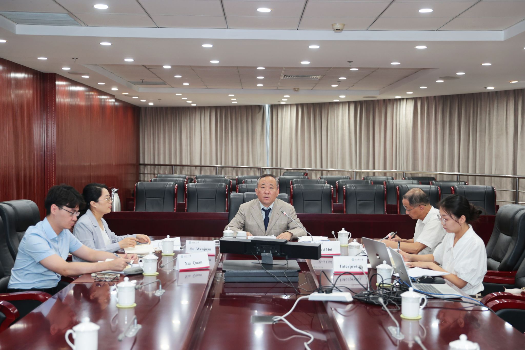 让-马克·奥杰校长在致辞中表示,拉罗谢尔大学非常重视与中国以及北语的合作关系,认为孔院是两校及两国重要的沟通桥梁。拉罗谢尔大学的各个部门和孔院团结协作,发展势头良好。特别是今年正值中法建交60周年,希望同北语开展更多的深度合作。随后,让-马克·奥杰校长和段鹏校长就两校可开展合作的具体领域进行了热烈讨论,并在重点人才联合培养、博士生项目、高新技术应用及智慧教育、开拓欧盟高校合作等方面达成了合作意向。