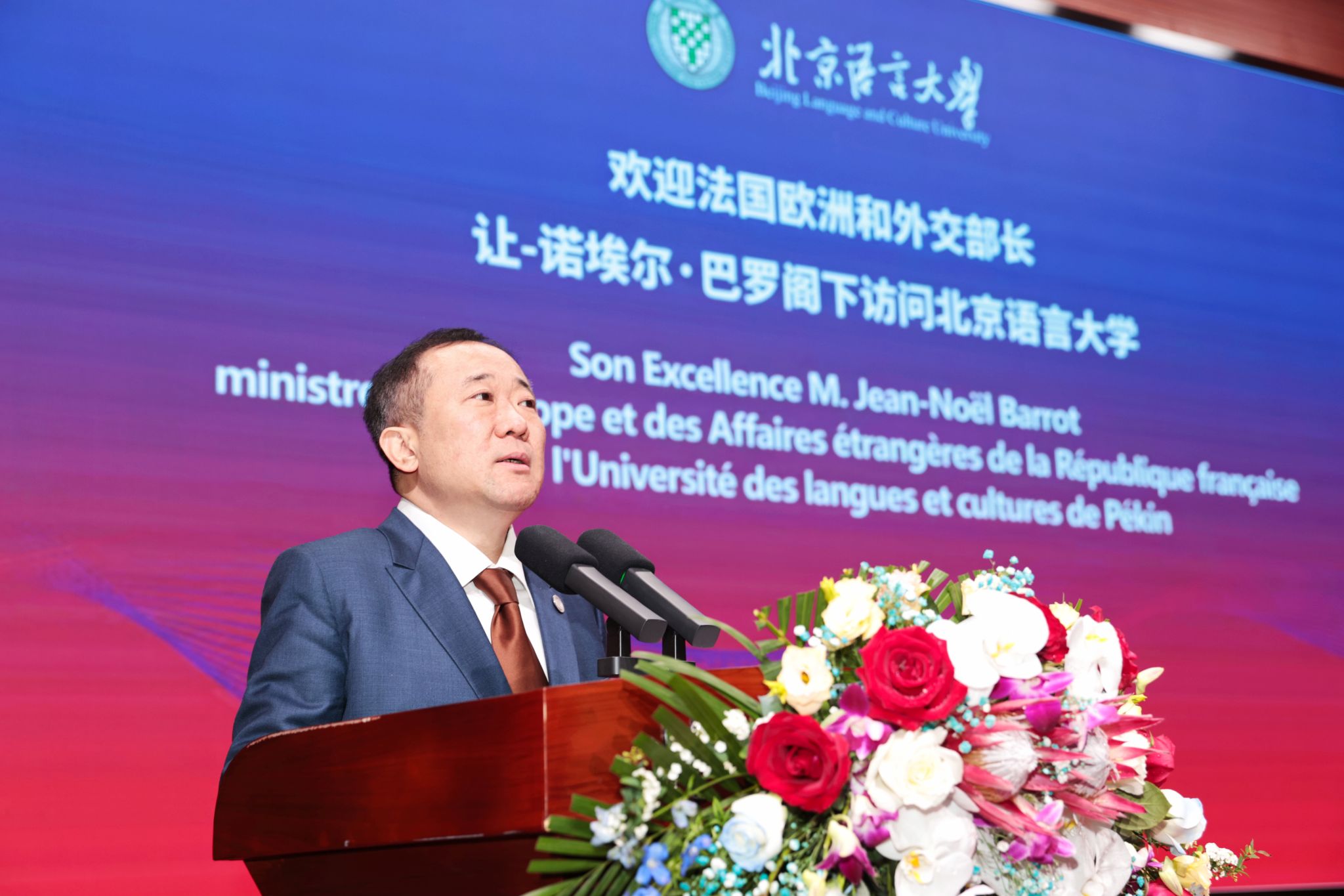 巴罗外长在逸夫报告厅向北京语言大学师生代表发表演讲。演讲中首先感谢北京语言大学对他本次访问的盛情接待,以及为培养前法国驻华大使白林等一大批法国高级外交官而做出的努力。他希望学校继续激发和鼓励中法学生,在他们中培养出下一个大使、外长。他还就增进中法友谊、促进全球合作以应对挑战以及促进中法教育合作等话题与现场师生进行了深入的分享,并回答了学生代表的提问。