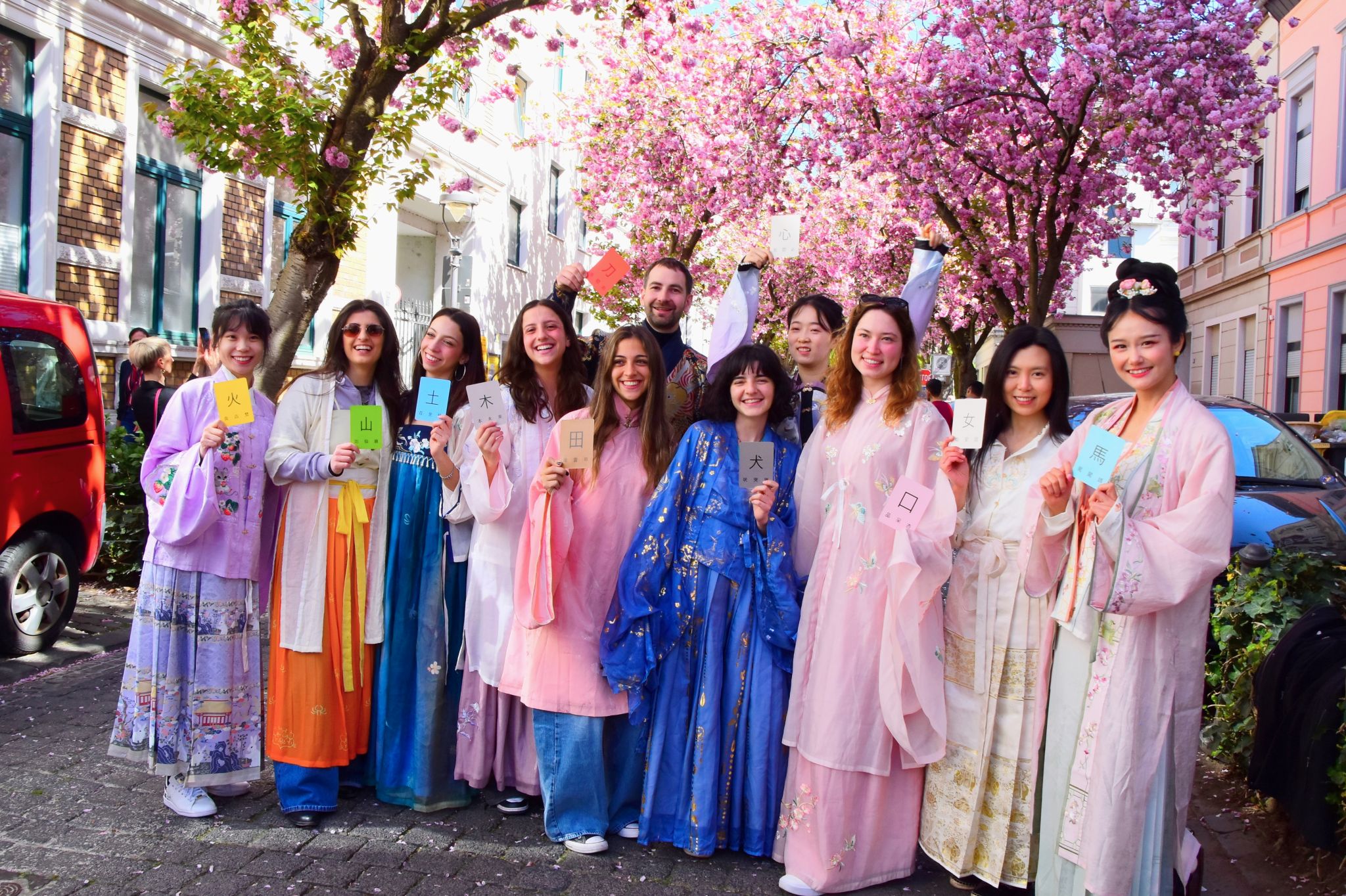本次中文日主要围绕“春日赏樱”这一当地特色展开。梅、兰、竹、菊、牡丹固然在中国花卉中享有崇高地位,但唐诗之中也有不少有关樱花的诗句,例如元稹《折枝花赠行》一诗:“樱花树下送君时,一寸春心逐折枝。别后相思最多处,千株万片绕林垂。”因此,波恩孔院特地策划了贴合春日美景的中国语言文化活动。