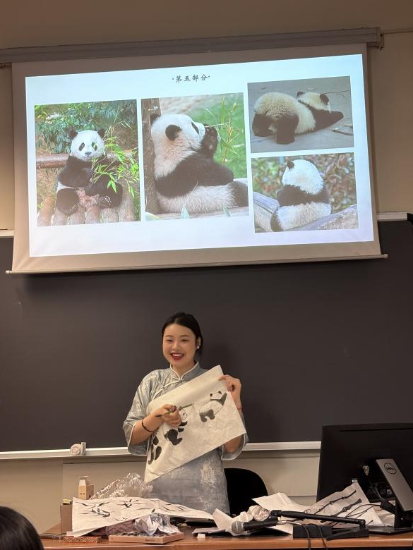 在完成基本笔触练习后,黎佳欣老师带大家进入今天的主题创作:熊猫与竹子。她首先展示了中国画中以熊猫为主题的作品,引导学生们细致观察其形体结构,讲解国画中粗细毛笔的交替运用,并循序渐进地演示如何分步骤绘制出熊猫身体的各个部分。