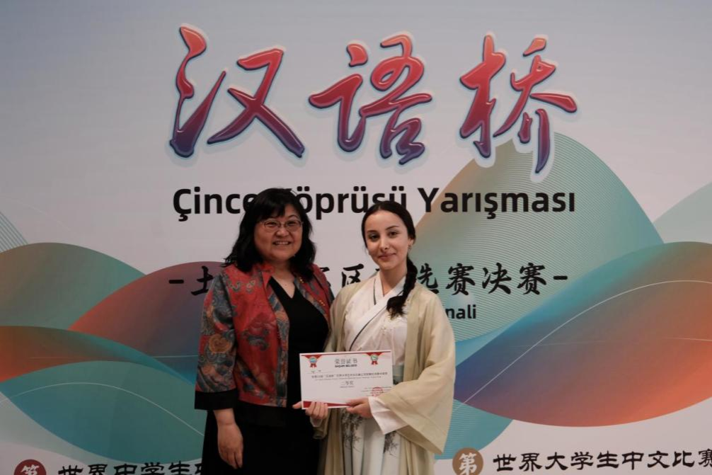 经过两轮激烈角逐,韵婉从14位选手中脱颖而出,获得了第二名的好成绩。作为所有参赛者中学习中文时间最短的选手,韵婉以其标准流利的汉语和出色的才艺表演,赢得了评委们的肯定。中国驻土耳其大使馆周美芬参赞为其颁奖。