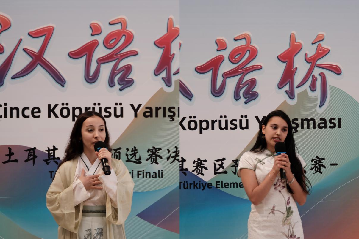 在比赛中,选手们热情饱满,为在场的评委和观众呈现了精彩的中文主题演讲和丰富多样的才艺表演,奥坎孔院指导并选送的选手也表现优异。在中文演讲环节,奥坎大学中土翻译系预备班的韵婉(Ezgi İlke)结合自身经历,生动展现中土文化的深厚共鸣。她呼吁通过美食、音乐、语言等民间交流形式,搭建文明互鉴的桥梁,共同续写中土友谊的新篇章。韵婉以自己在中餐厅兼职、学习葫芦丝的经历,强调文化不是隔阂,而是普通人可参与的“交融桥梁”,并倡导青年应成为文化交流的使者,用真诚与行动推动中土友谊的当代传承。同为预备班学生的爱芦(Eylül Saka)则以个人学习中文的经历为切入点,结合土耳其作为“文明交汇点”的地理属性与文化特质,以音乐为喻,将全球化比喻为多元共鸣的“交响乐”。她呼吁青年肩负起守护文化多样性、促进文明互鉴的责任,积极推动不同文化之间的理解与尊重。