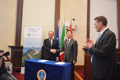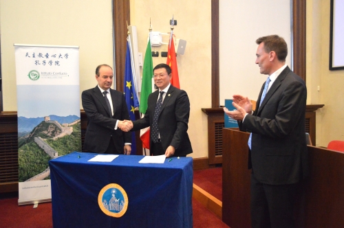 米兰天主教圣心大学孔子学院庆祝建院十周年之际,于5月14日隆重举办了《中国孔子学院总部与米兰天主教圣心大学关于继续合作建设米兰天主教圣心大学孔子学院的协议》及《意大利教育部支持下北京语言大学和意大利米兰天主教圣心大学合作备忘录》签字仪式。国家汉办副总干事马箭飞教授、北京语言大学校长刘利教授、米兰天主教圣心大学校长安耐里(Franco Anelli)教授等嘉宾出席了仪式。