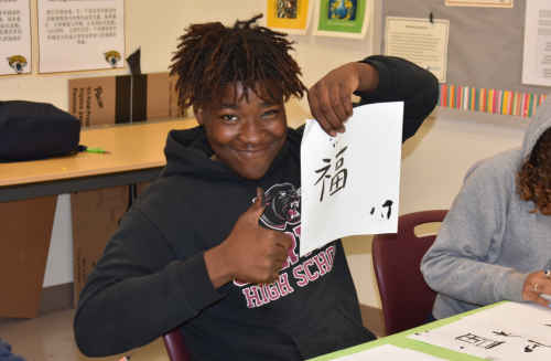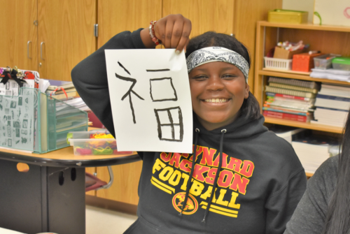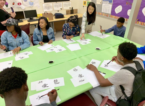 2019年5月20日,佐治亚州立大学孔子学院在Martin Luther King Jr. Middle School举办了“中国书法“活动,该校约200名中学生参加了此次活动。不同于之前的画脸谱与折扇活动,本次活动的主要参与对象为美国公立学校的中学。因此,根据学生特点,孔院工作人员首先为其讲解了中国书法中的“笔、墨、纸、砚”的含义、如何握笔等,随后又为他们展示了”福、爱、龙“等汉字。学生们在孔院工作人员的教学和指导下,认真地学习中国书法。