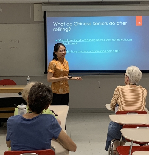 6月5日,梅森孔院李华老师面向北维终生学习学院的老年学员介绍了中国人口老龄化的现状以及中国老人的退休生活,并对中美两国人口老龄化的特点进行了对比。讲座内容既有大量真实数据,又有视频采访展示中国老年人丰富充实的日常生活,听众们表现出了极大兴趣,纷纷对各自感兴趣的问题进行提问。受讲座启发,大家还主动结合美国社会现状向李老师介绍美国老人的退休生活。通过讲座、互动及提问,听众对中国国情有了更多的了解。讲座结束后,大家仍然意犹未尽地走到李老师身边进行讨论和提问。大家纷纷感谢孔院带来有关中国老人的新鲜资讯。