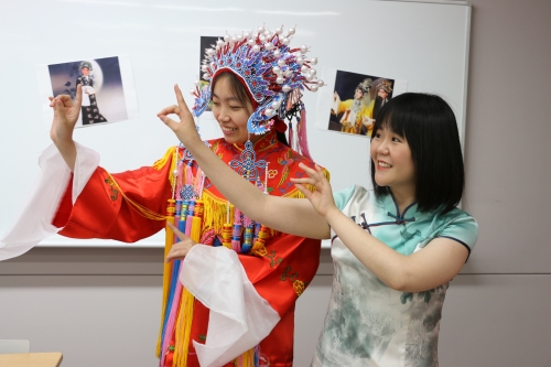 6月16日是关西外国语大学的第二次校园开放日,孔子学院为前来参加活动的高中生和家长们准备了一场颇具特色的中国京剧文化体验。美轮美奂的京剧图片、各式各样的脸谱图案、栩栩如生的京剧人偶装点了整个教室,明亮的灯光打在展桌上,一袭长袍马褂、一袭凤冠霞帔显得格外地耀眼。高中生和家长们无不被深深吸引,纷纷饶有兴致地走了进来。