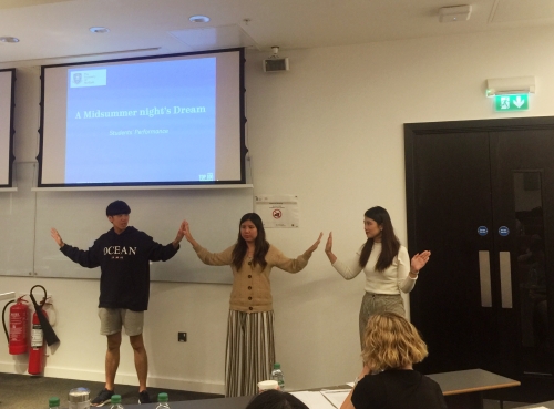 大家首先通过一段视频回顾了本次培训的文化课程与实践活动。随着镜头一幕幕转换,同学们仿佛又重新回到了悄悄溜走的岁月中,感动、温暖、不舍,五味杂陈的思绪在心头游走。随后,同学们在项目培训导师克尔斯蒂·瑟吉(Kirsty Surgey)的指导下,表演了此次文化研修的成果——莎士比亚经典戏剧《仲夏夜之梦》。