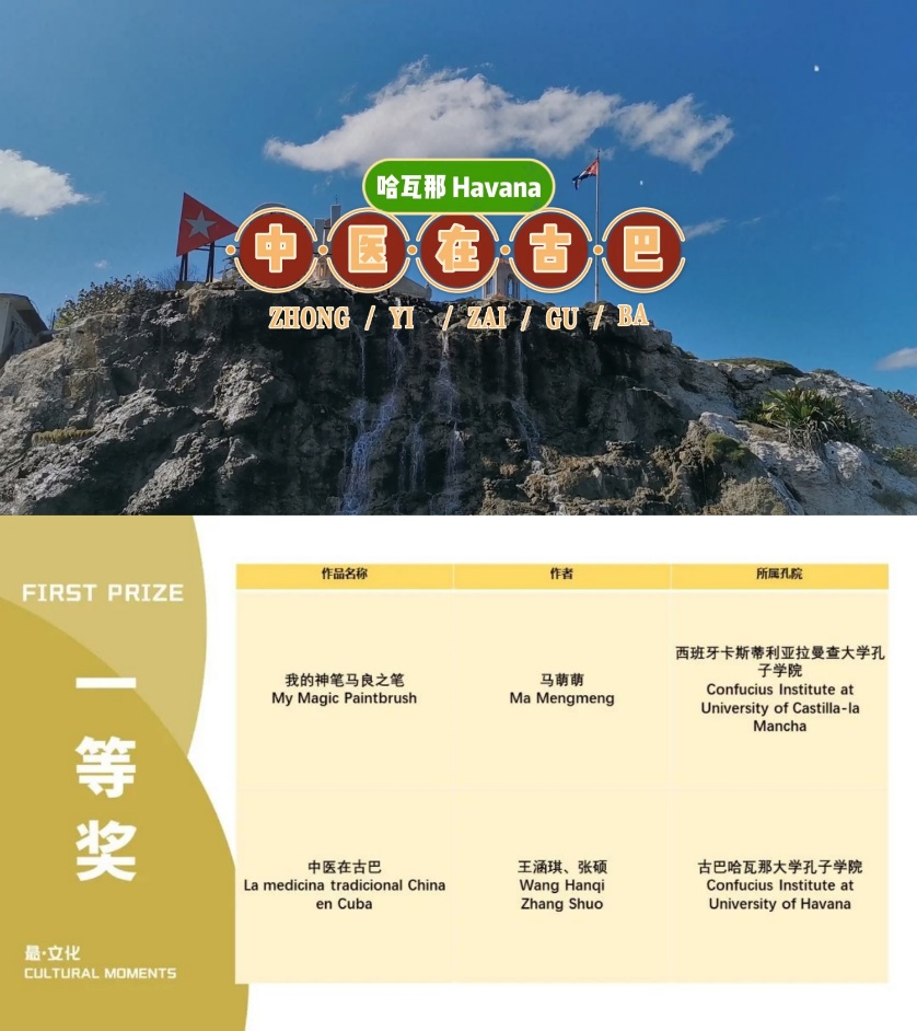 来自68个国家的119所孔子学院共创作视频作品496部,经专家层层筛选及大众投票,活动最终评选出3个特等奖、6个一等奖、10个二等奖、21个三等奖、60个优秀奖及12个最具人气奖。哈瓦那大学孔院共提交三部作品,其中两部雀屏中选:孔院教师王涵琪、张硕创作的《中医在古巴》荣获一等奖,孔院教师常晓宇、涂巧为创作的《英娣拉的一天》荣获三等奖。