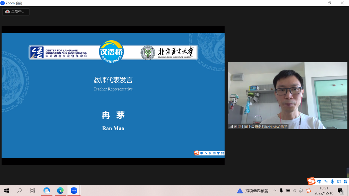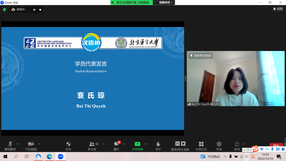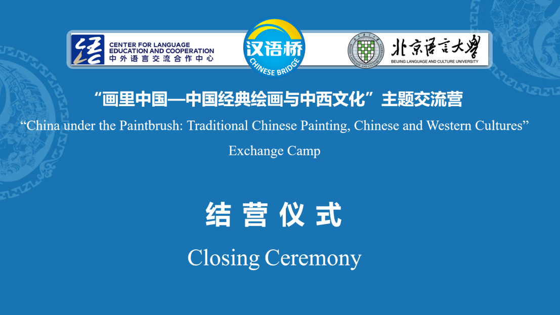 来自3班的学员代表江瑞起同学表示,非常感谢北京语言大学,让学员们有机会,与不同国家的同学一起学习中国绘画知识,用中文进行交流。在过去的两个星期中,他们不仅学到了宫廷画、民俗画等不同题材的绘画,而且在交流中锻炼了的中文,收获很多。