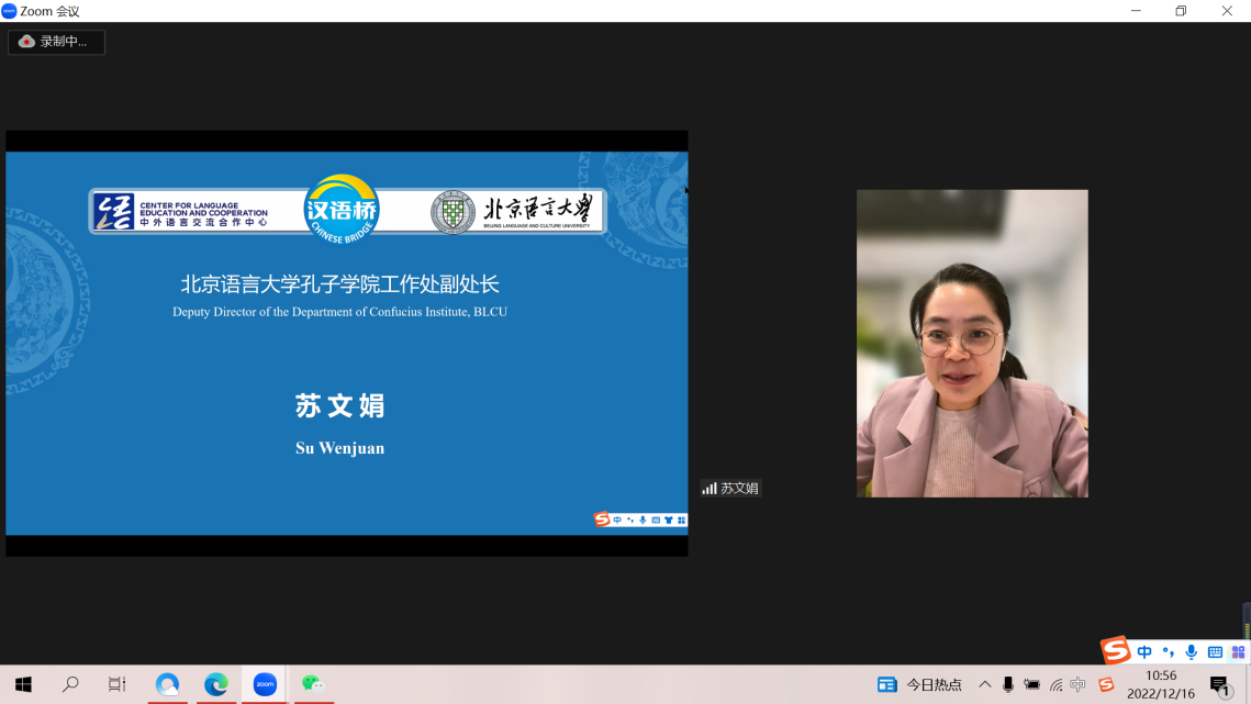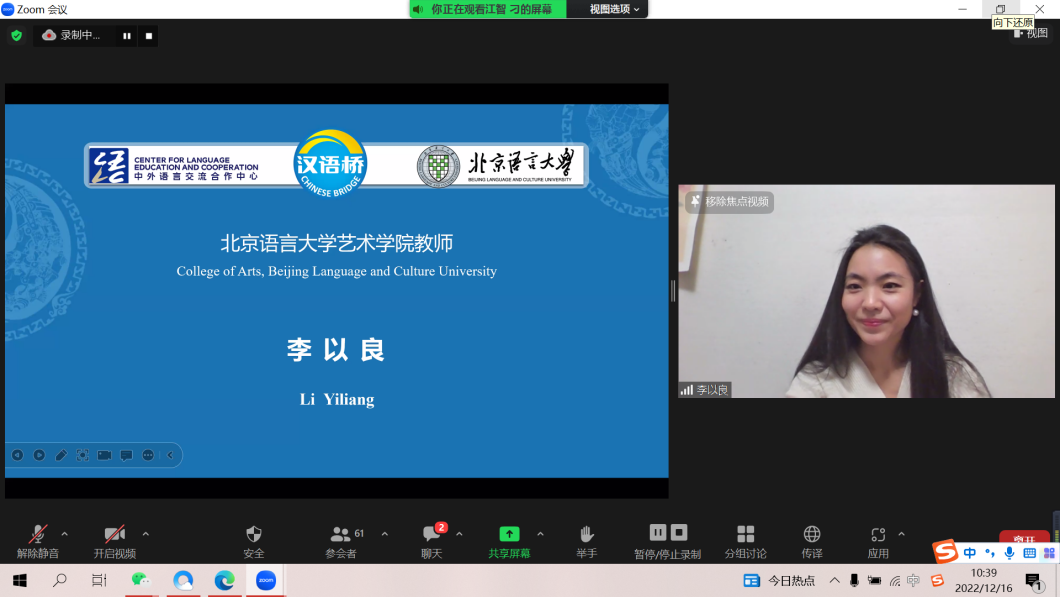 来自中国的学员代表何敏谈到了她的收获,通过老师的讲解,自己了解了以前没有接触到的一些绘画背后的中国文化,同时通过其他国家学员们的用心分享,看到了世界不同地方的精彩文化。并从一个中文老师的角度学习到了讲师们如何讲解绘画中的文化,如何巧妙地将绘画和语言知识结合在一起,以及如何运用多媒体上好一节语言文化课。