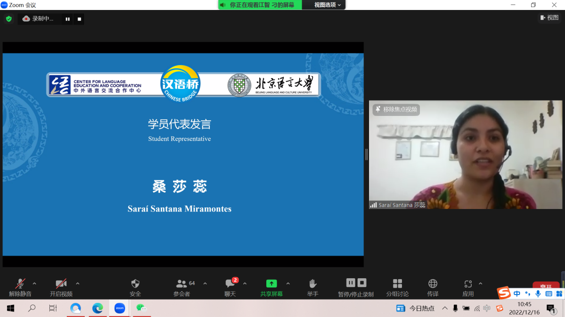 北京时间12月16日,由教育部中外语言交流合作中心主办,北京语言大学承办的“画里中国——中国经典绘画与中西文化”主题交流营圆满结束。北京语言大学孔子学院工作处副处长苏文娟、艺术学院青年教师李以良,以及来自阿根廷、巴西、波多黎各、秘鲁、厄瓜多尔、哥斯达黎加、古巴、墨西哥、特立尼达和多巴哥、委内瑞拉、越南、智利等12个国家的总计130名营员参加了结营仪式。