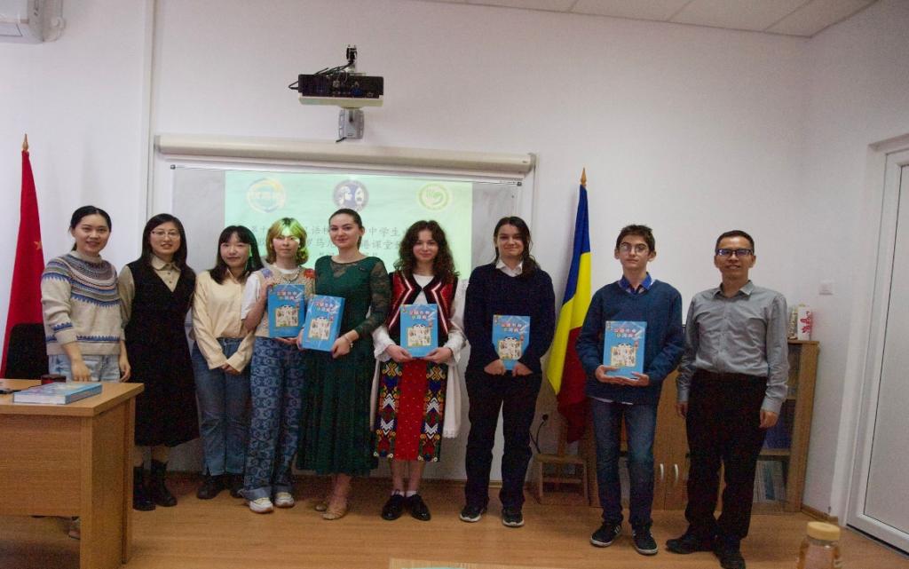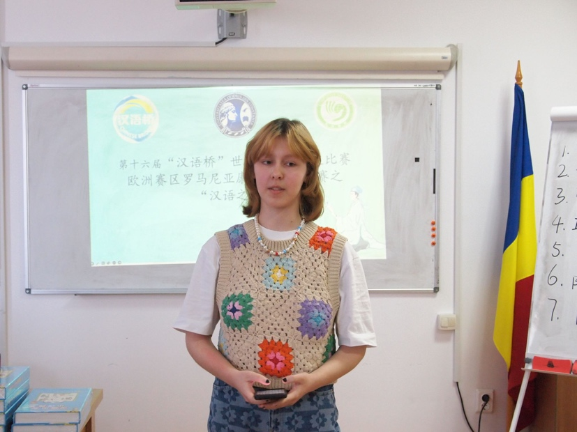 第一个环节是中文演讲。莹莹(Andrei Ana)介绍了自己学习中文的故事,她说中文很有意思,经常和家人一起学习,希望能早日说一口流利的汉语。牧遥(Radu Milena)介绍了自己的中国旅行梦,她对中国的建筑、美食都非常感兴趣,希望有机会去中国旅行。