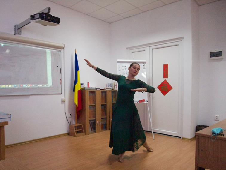 最后是才艺展示。扬库(Iancu Andra)身着绿色长裙,伴随着优美的音乐,翩翩起舞,整个舞蹈动作优雅,赏心悦目。白娜(Băltianu Ștefania-Alexandra)身着传统服饰,为大家表演了一段节奏欢快的罗马尼亚舞蹈,让人印象深刻。阿乐(Belei Alexandru)表演了吉他独奏《平凡之路》,教室里充满了欢乐的气氛。