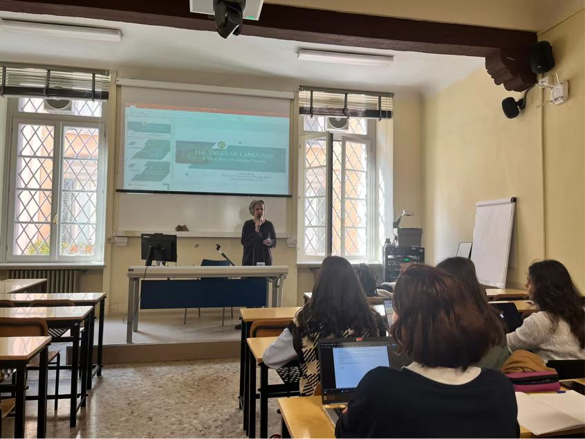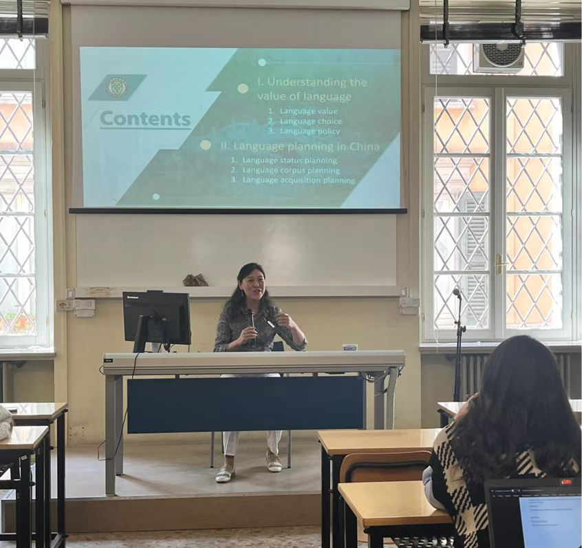 为迎接2023年国际中文日,推动中意文化互鉴互融,当地时间4月18日上午,意大利米兰天主教圣心大学孔子学院中方院长梁清教授应圣心大学布雷西亚校区语言学教授莎拉·齐格达(Sara Cigada)之邀,作“从中文看语言的价值”专题讲座。圣心大学齐格达教授、贝拉琪(Enrich Peracin)教授,兰白娣(Cristina Rambaldini)教授,孔院意方秘书安娜(Annachiara Maddaloni),孔院志愿者教师班竹青以及圣心大学语言学和中文相关专业学生共数十人参加本次讲座。