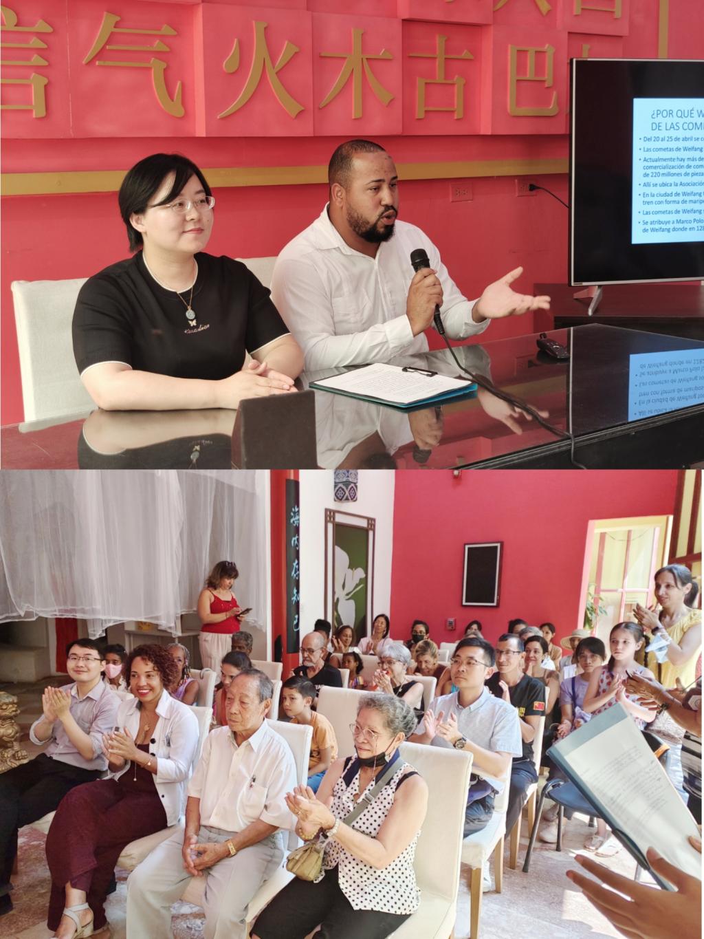 讲座伊始,季倩倩女士表示山东潍坊一年一度的风筝节上个月刚刚成功举办,作为潍坊人,她热衷于推广风筝文化,让古巴朋友能亲身感受中国古老且焕发现代魅力的风筝;作为两个孩子的母亲,她也希望古巴孩童功课之余放放风筝,欢声笑语自在奔跑,愉悦身心。纯粹且真挚的感情最能动人心弦,孔院也非常感谢华星公司捐赠这批精美的风筝,让风筝飞入古巴百姓的生活。