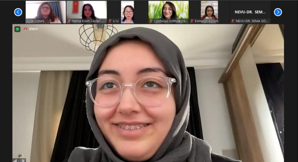 参加此次颁奖典礼的观众不仅有来自土耳其四所孔子学院的学员,还有土耳其设有中文或中国语言文学专业的师生。虽然是线上颁奖典礼,但活动现场气氛热烈,更有获奖选手为大家现场演唱中文歌曲。奥坎孔院学员心慧作为获奖选手代表发表感言。她不仅表达了自己激动兴奋的心情,还感谢了奥坎孔院及中土翻译系预备班的老师和同学们。心慧还表示,自己现在只学习了几个月的汉语,因此她还有很多知识需要学习,对汉语及中国文化的热爱会激励她继续努力学好汉语。