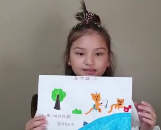 (霍晓今同学边展示自己的手绘画边讲故事)