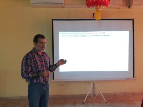 讲座中,弗洛里德先生简单陈述了中古两国经济和政治关系的发展历程。他指出古巴与中国自1960年建立外交关系以来,两国保持着友好合作互利共赢的和谐关系。在政治方面,双方有着相同的信念:坚持政治互信,分享治国理政经验,共同致力于社会主义建设与发展,反对霸权主义及一切违反国际法的行为。经济方面,古巴与中国联系也十分紧密,近年来随着古巴与中国投资合作的不断加强,两国均在多项领域实现了多元化发展,如生物技术、旅游业、进出口贸易等等。